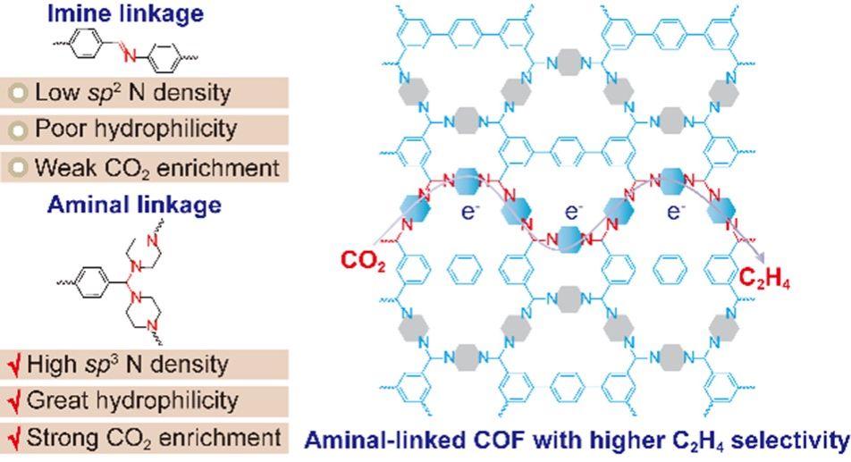 乙烯是世界上最重要的化工原料之一, 主要依靠化石能源,通过高能裂解反应和精馏获得,由此产生的大量CO2排放加剧了全球变暖。电催化CO2还原反应(CO2RR)生产高附加值乙烯(C2H4)有利于能源和环境的可持续发展,但绝大多数电催化剂都以金属铜为基础。那么,是否可能开发一种无金属电催化剂来实现高效的电催化CO2RR制乙烯?近日,柯福生团队通过连接键工程在COF骨架中引入高密度sp3 N催化阵列,实现了无金属电催化剂高效电催化CO2RR制乙烯。