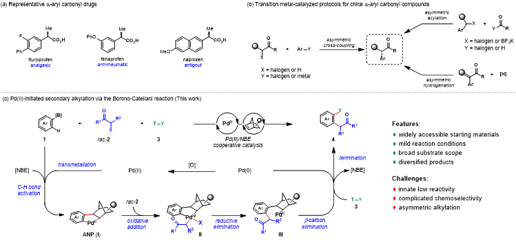 α-芳基羰基衍生物在医药领域具有极高价值,例如氟比洛芬、菲诺洛芬和萘普生等分别在镇痛、抗风湿和抗痛风等方面发挥重要作用。目前报道的方法功能单一,产物多样性有限且通常需要特殊官能化的底物和苛刻的反应条件,这一定程度限制了应用范围。因此,随着对新型药物需求的增加,开发高效合成 α-芳基羰基衍生物的新方法迫在眉睫。
