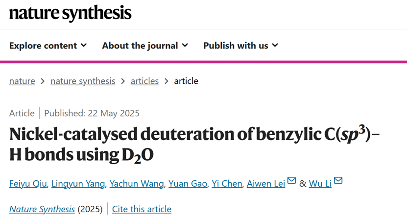 雷爱文/李武团队在国际权威学术期刊《自然·合成》(Nature Synthesis)发表题为“Nickel-catalysed deuteration of benzylic C(sp3)–H bonds using D2O”的研究论文。该团队成功开发出一种异相镍催化体系,使用重水作为氘源对芳烃苄位C(sp3)–H实现选择性氢氘交换反应。骰宝