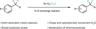 苄位C(sp3)–H键,特别是伯碳中的C(sp3)–H键,在药物和生物活性分子中普遍存在,其选择性修饰(如甲基化、氟化或氘代)可显著改变分子构象、溶解度和药代动力学特性。此外,在候选药物的优化过程中,三氘甲基(CD₃)的引入可通过同位素效应延长药物代谢周期,并开发了一些临床上重要的氘代化合物。因此,开发针对小分子药物中存在的苄位选择性和实用性氘标记方法受到广泛关注。然而迄今为止,所有已知的用于苄位氘标记的催化反应大多都依赖于昂贵的贵金属或氘代试剂。