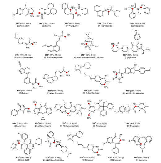 随后,作者对底物适用性进行了探索。作者开发的这种方法对于氨基酸类底物的氢氘交换具有广泛的适用性,并且即使在存在较大空间位阻的情况下,通过优化反应条件也能够获得良好的氘代效果。含酯基和羰基的药物分子及天然产物也有较好的氘代率,例如,萨利麝香,异丁司特和己酮可可碱等。除此之外,多种具有酰胺类结构的不同生物活性的药物分子在此反应条件下均能获得良好的氘代效果。这包括具有神经保护和益智作用的阿尼西坦)、具有抗肿瘤活性的苦参碱、有抗虫效果的吡喹酮、除草剂草萘胺、抗胆碱剂托吡卡胺、抑制剂阿哌沙班,安眠剂扎来普隆。同时,作者还实现了部分药物的克级氘代,例如具有抗癌活性的AGI-5198和精神类药物阿塞那平等。这些结果进一步证明了该方法的广泛适用性,能够适应含有不同官能团和活性位点的复杂药物分子,为药物的同位素标记和后续的药效学研究提供了有力支持。
