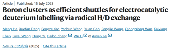 2025年7月15日,骰宝 雷爱文/李武/张海波在国际权威学术期刊《自然·催化》(Nature Catalysis, IF: 44.6)在线发表题为“Boron clusters as efficient shuttles for electrocatalytic deuterium labelling via radical H/D exchange”的研究论文。骰宝 何萌博士、邓雪帆博士和姚丰泽为论文共同第一作者,骰宝 雷爱文教授李武教授、张海波副教授为论文通讯作者,骰宝 为唯一通讯单位。