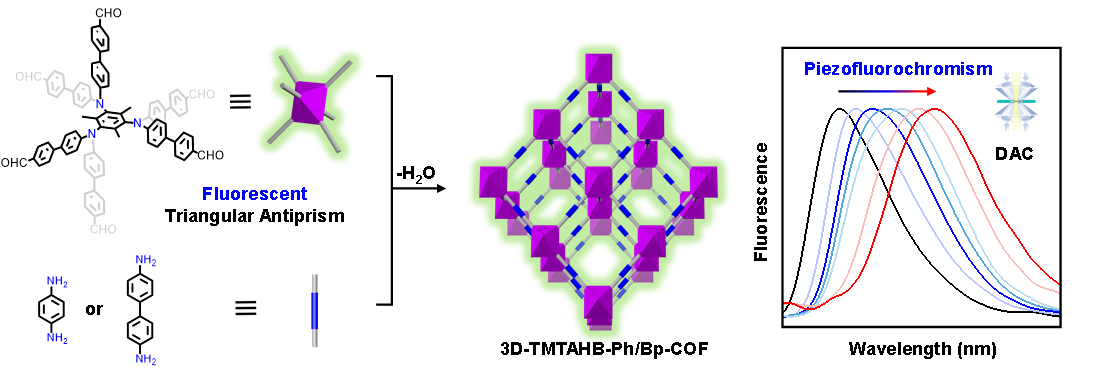 近日,国际权威期刊《德国应用化学》(Angewante Chemie International Edition)发表骰宝 汪成教授团队的最新研究成果,该研究报道了基于新型六连接反三棱柱荧光节点的压致荧光变色三维共价有机框架材料。