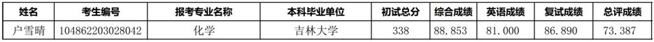 同时,根据化学专业复试总评成绩排序,依次递补拟录取化学专业考生户雪晴。