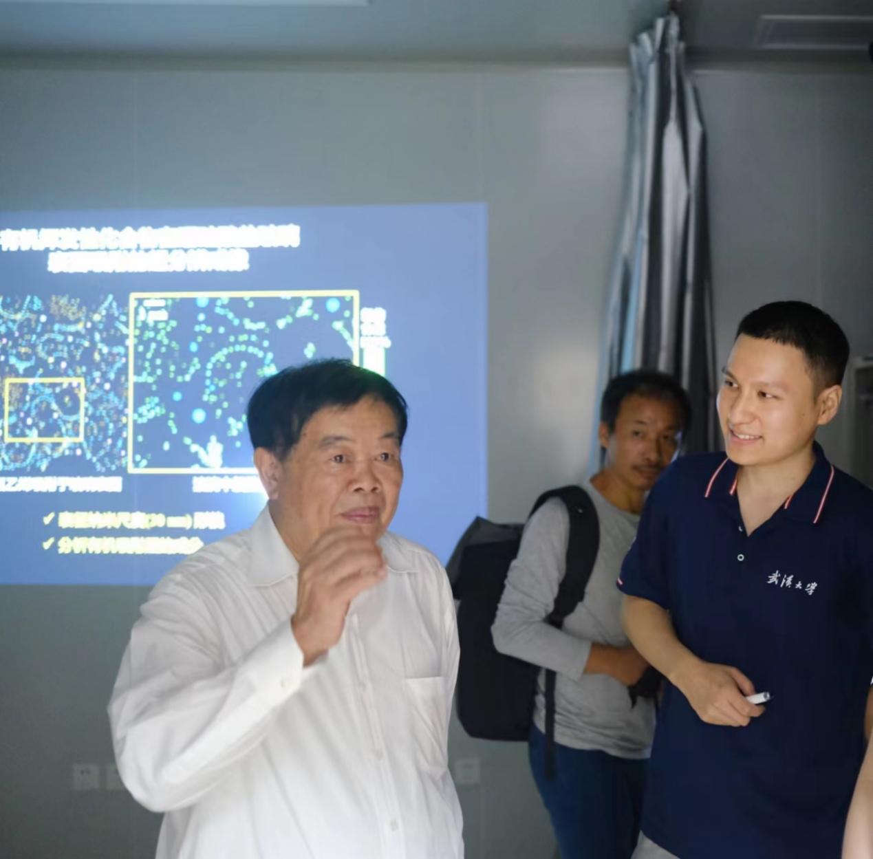 第二站曹德旺一行参观了燃料电池电化学实验室。院长庄林教授首先介绍了实验室的研究方向,开展的相关基础研究,以及突出的研究特色。其后庄林教授重点介绍了有关碱性聚合物电解质燃料电池相关方面的研究。在当前习近平总书记提出的双碳政策的背景下,高效利用氢能是实现无碳排放的重要方式。有关碱性聚合物电解质燃料电池的研究利用了自主研发的高性能碱性聚合物膜材料,高效地将氢能转化为所需的能量。目前所研发的碱性膜材料对未来碱性聚合物电解质燃料电池技术的推广及使用具有重大的意义。曹德旺董事长与课题组的研究生亲切交流,巧遇来自家乡福建福清的研究生任仁捷,并与大家合影留念,。