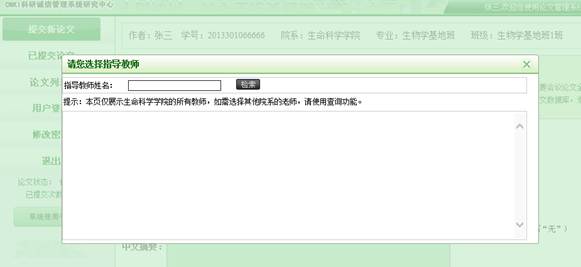 5、点击“指导教师”一栏,会出现下图页面,输入指导教师姓名,点击“检索”,会出现指导教师的名字,选则指导教师,而后系统会自动跳转到上图页面。再按照要求依次输入相关内容,然后点击“浏览”上传论文,点击“提交”,完成论文上传检测。
