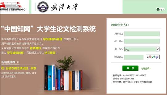 1、登陆“中国知网”大学生论文检测系统//whu.check.cnki.net/(请保存此链接,一定要点击这个链接!),点击学生入口。显示如下页面,输入用户名和密码,学生登陆用户名和密码均是本人学号。身份选择学生,登陆验证码不分大小写。