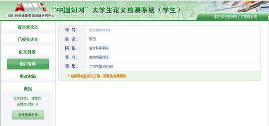 7、对于论文初检不合格的学生,再次对修改后的毕业论文检测前,需要向院系管理员申请权限,当院系管理员重新分配权限后,复检学生再次登录该系统,登录后会显示如下页面。在“提交权限”一栏会显示“请重新提交”字样,这表明院系管理员已经给予权限,可再次提交论文。同时,在该页面可以看到论文状态、指导教师对第一次提交论文的修改意见和审阅意见。