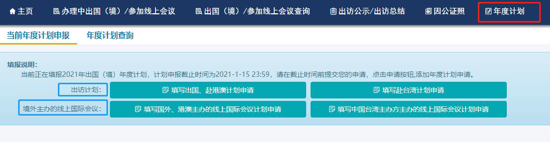 1、进入“因公临时出国(境)综合管理服务系统”中的“年度计划”,点击对应按钮项,逐项填写并提交即可。