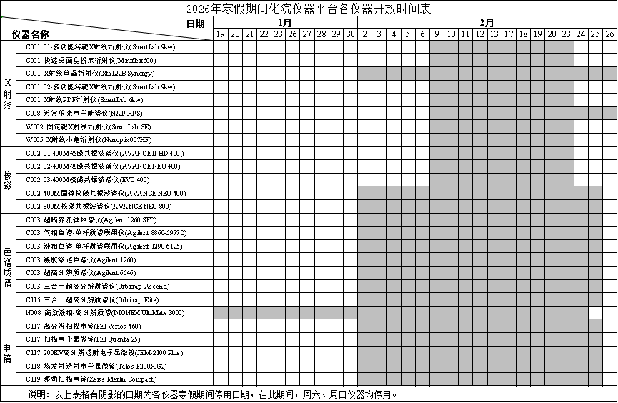 学校定于2026年1月21日至2月26日为学校寒假时间。以下为寒假期间化院仪器平台各仪器开放时间表,请同学们根据测样需求,合理安排送样时间,如有急样或特殊情况可提前与负责老师电话沟通。