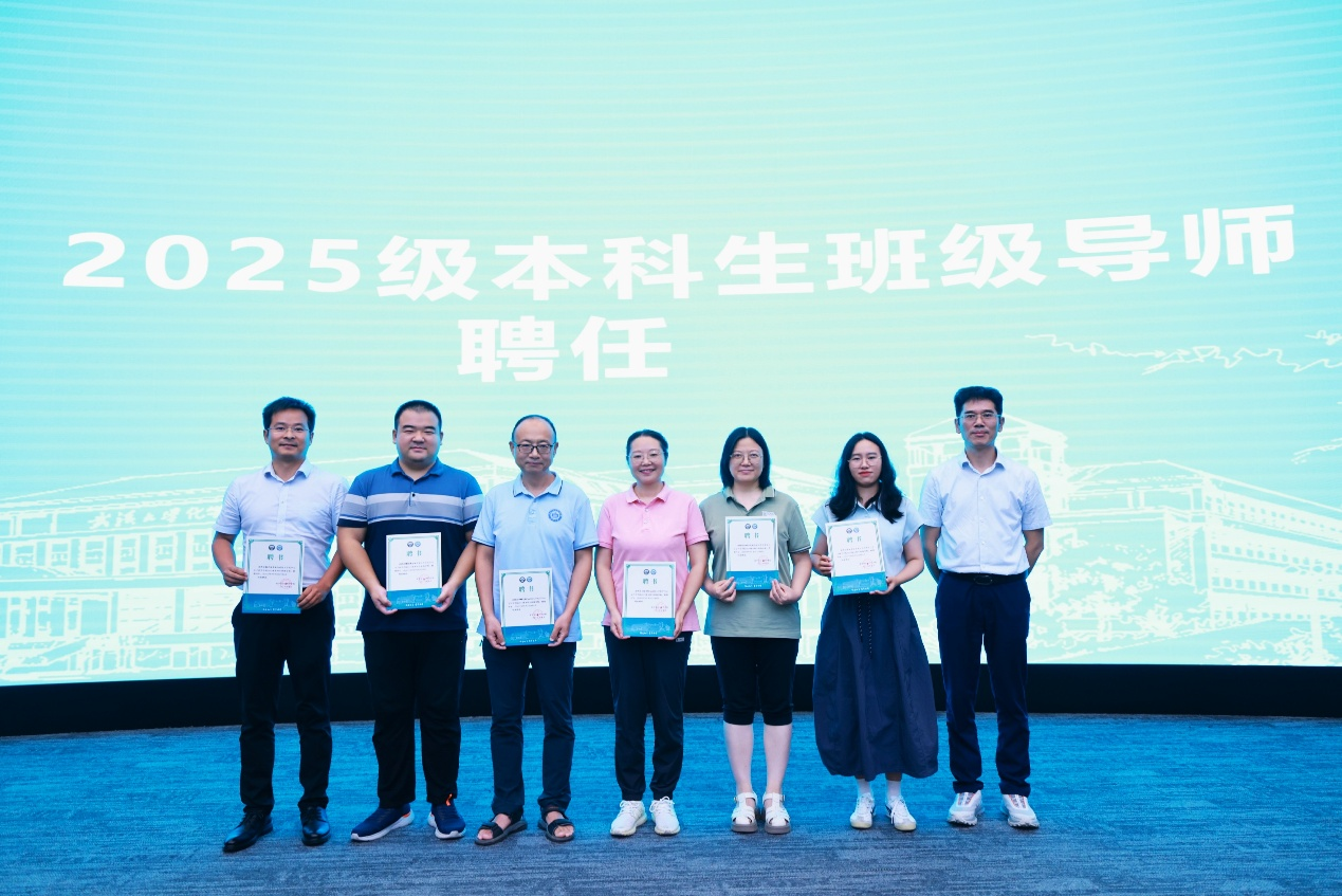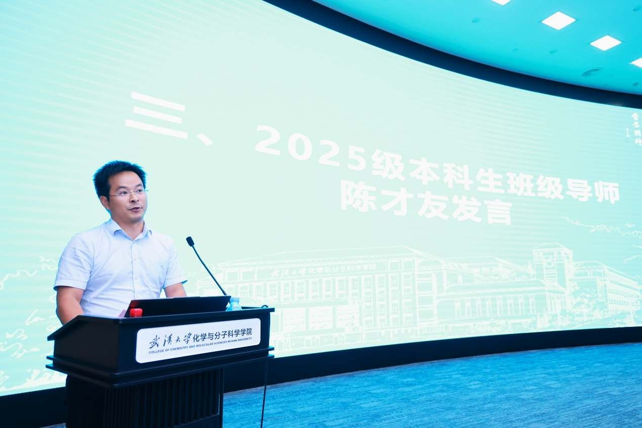 随后举行2025级本科生班级导师聘任仪式,副院长周金平教授为陈才友、魏振威、李峰、丁琼、余琼卫、彭双六位班级导师颁发聘书。作为班级导师代表,陈才友教授在发言中分享了自己在武大求学和科研的经历,勉励新生永葆好奇之心、敢于探索未知、秉持坚韧之志、涵养家国情怀,尽快融入大学生活,早日确立科研志向。
