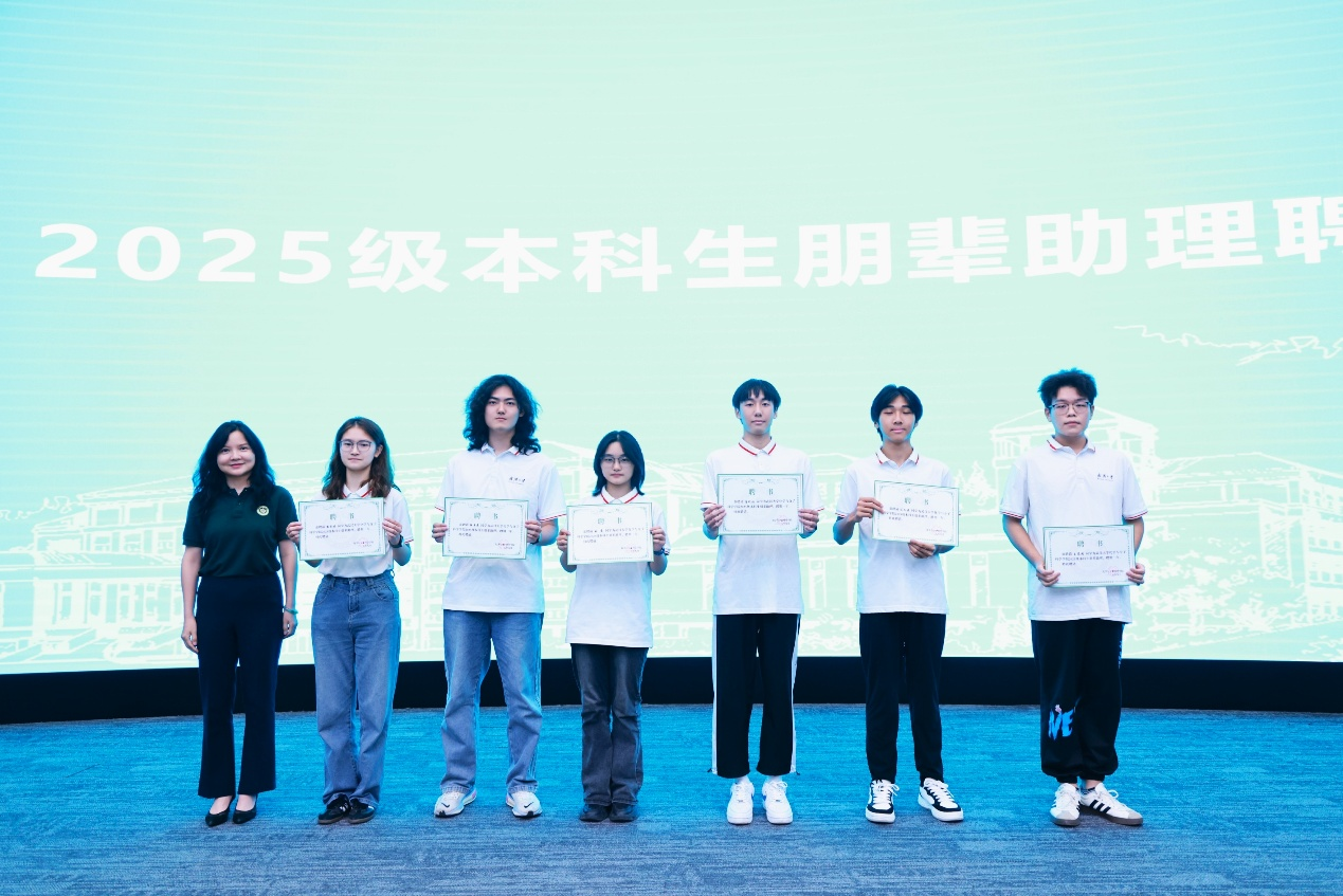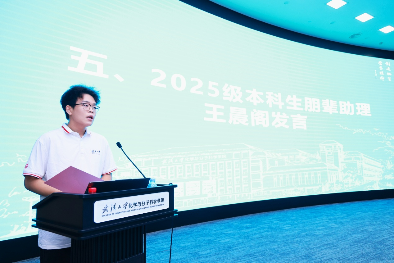 在朋辈助理聘任环节,党委副书记吕晶为潘雯婷、陆卓羲、张霞、唐昕浩、陈久森、王晨阁六位同学颁发聘书。“大学,就是学着长大”,朋辈助理代表王晨阁结合自身从迷茫到坚定的成长经历,鼓励新生主动适应环境、善用学院资源、勇敢探索未来,在化学的天地中找到属于自己的方向。