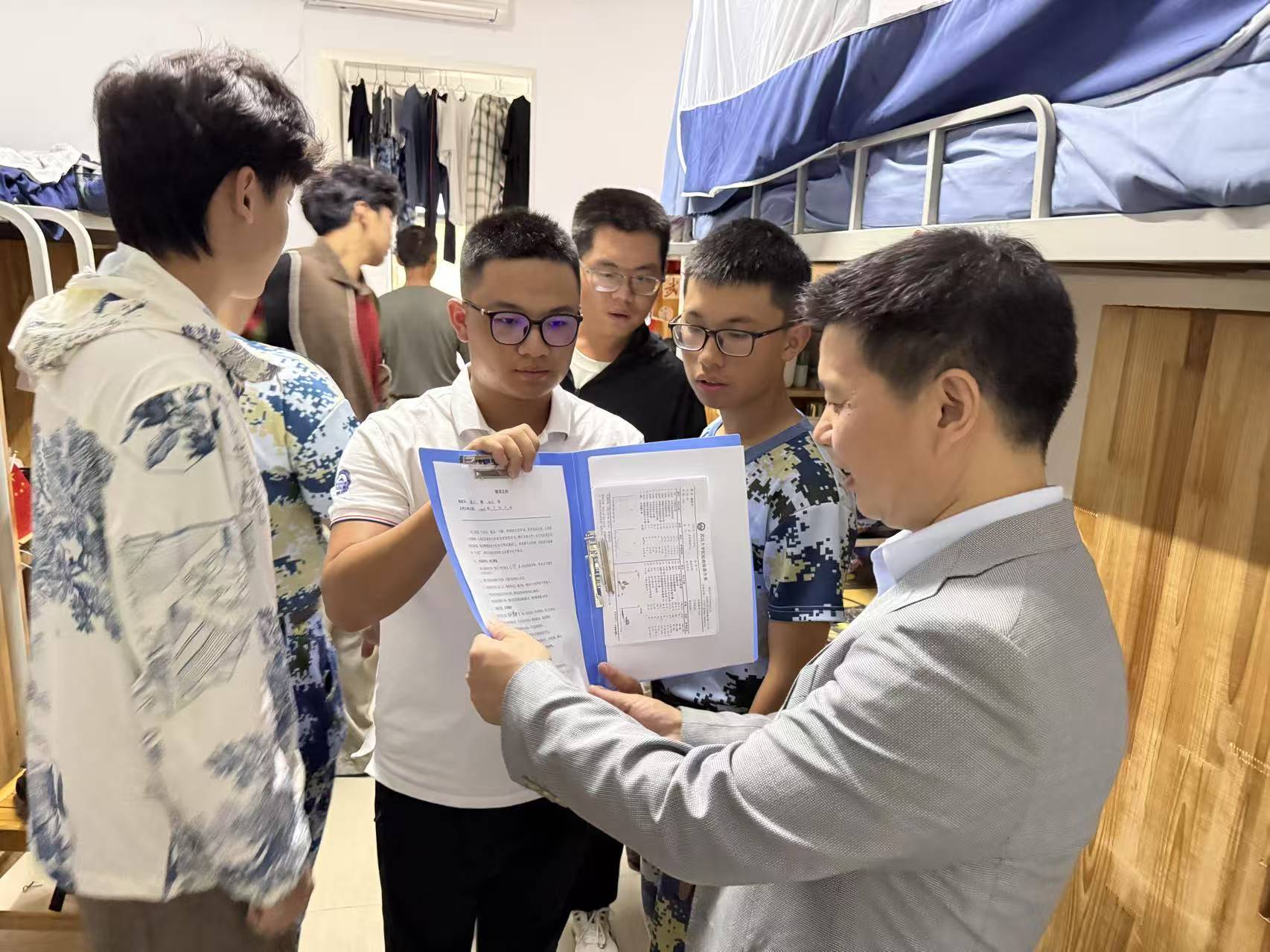 在宿舍区,学院领导老师与同学们亲切交流,细致询问同学们军训、入住体验和寝室相处等情况。同学们纷纷展示自己的内务整理成果,畅谈军训期间的感悟,并感谢学院领导和老师们的支持与关心。
