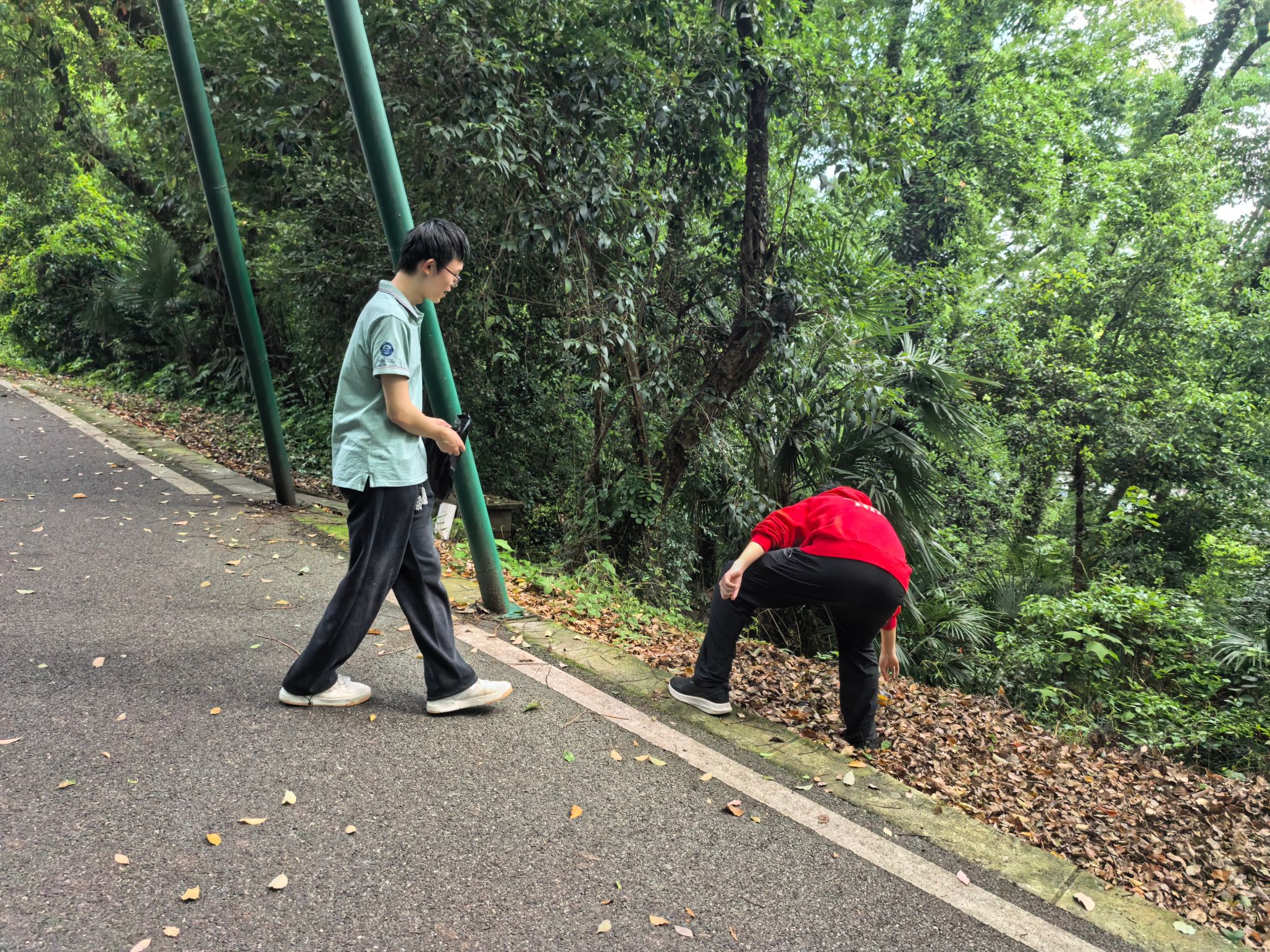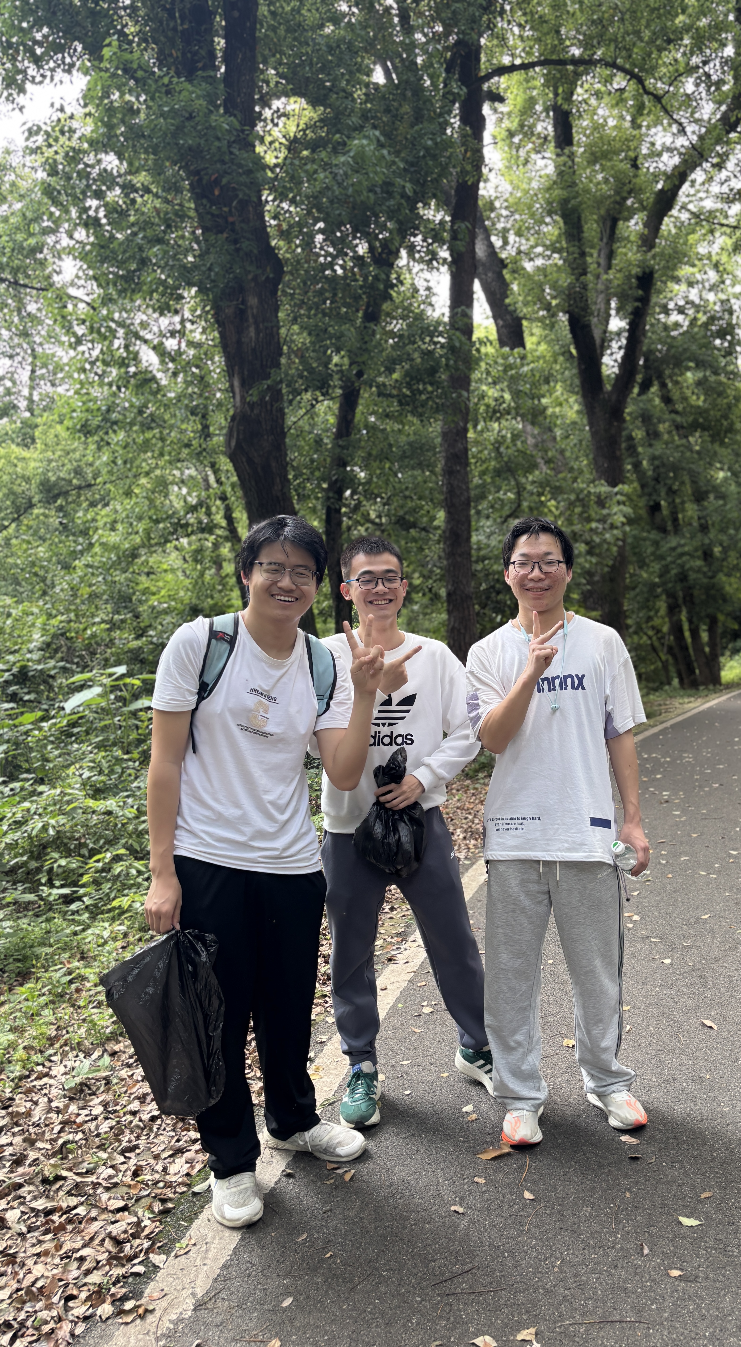 当天下午,同学们准时在珞珈山庄门口集合完毕,一张张青春洋溢的面孔在春日的暖阳下定格为一张集体合影。队伍沿环山南路前行,途经承载历史记忆的“十八栋”,再转入环山北路绕山而行。与单纯的登山踏青不同,同学们手中多了一份工具与责任——沿途俯身捡拾散落的垃圾,以实际行动践行劳动教育。途中,老师们也参与到清洁行动中,一边与同学们畅谈珞珈山的历史,一边聊近日学习生活。山林间跃动的身影与洁净如初的山道,构成了珞珈山最动人的春日图景。环山徒步与清洁后,队伍返回珞珈山庄门口,活动在汗水与欢笑中圆满收官。