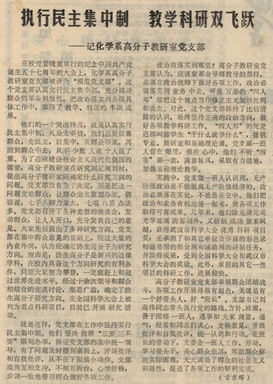 在校党委隆重举行的庆祝中国共产党诞生五十七周年的大会上,化学系高分子教研室党支部被评为“模范党支部”。这个党支部认真实行民主集中制,充分调动群众的革命积极性,把政治落实到各项具体工作中,取得了教学、科研的丰硕成果。