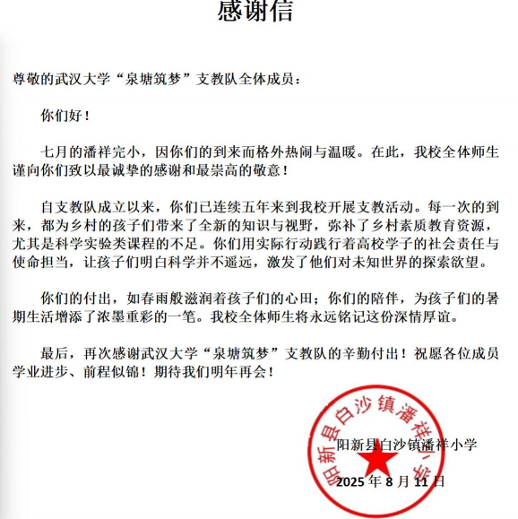 支教是一场青春之约,也是一次与未来的接力。支教队的志愿者们用付出收获成长,用热忱浇灌希望。支教队队员们纷纷表示,这份荣誉不仅是对过去五年努力的认可,更是继续前行的动力。未来我们将会继续深耕课程,播撒科学的种子,用爱心照亮孩子们的成长之路。“泉塘筑梦”支教队将在专业化道路上深耕,继续携手为乡村教育贡献武大力量。