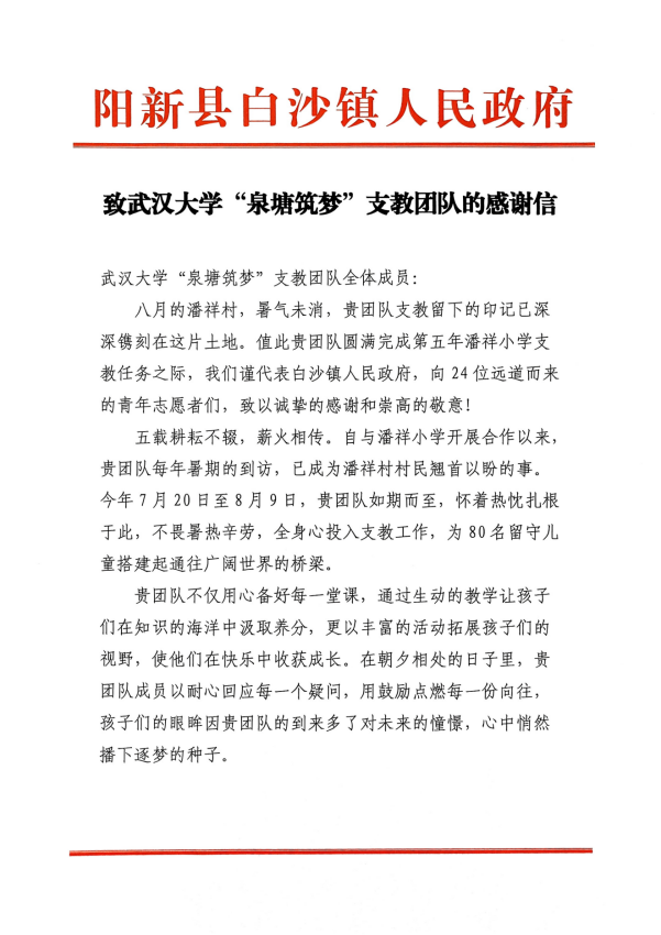 (通讯员:武凌宇、潘雯婷)近日,骰宝 收到白沙镇政府及潘祥小学感谢信及锦旗,感谢骰宝 “泉塘筑梦”支教队连续五年在潘祥小学开展的支教活动。今年24名支教队员继续开展为期三周的暑期支教活动,通过沉浸式的特色课程为乡村孩子们种下科学的萌芽。