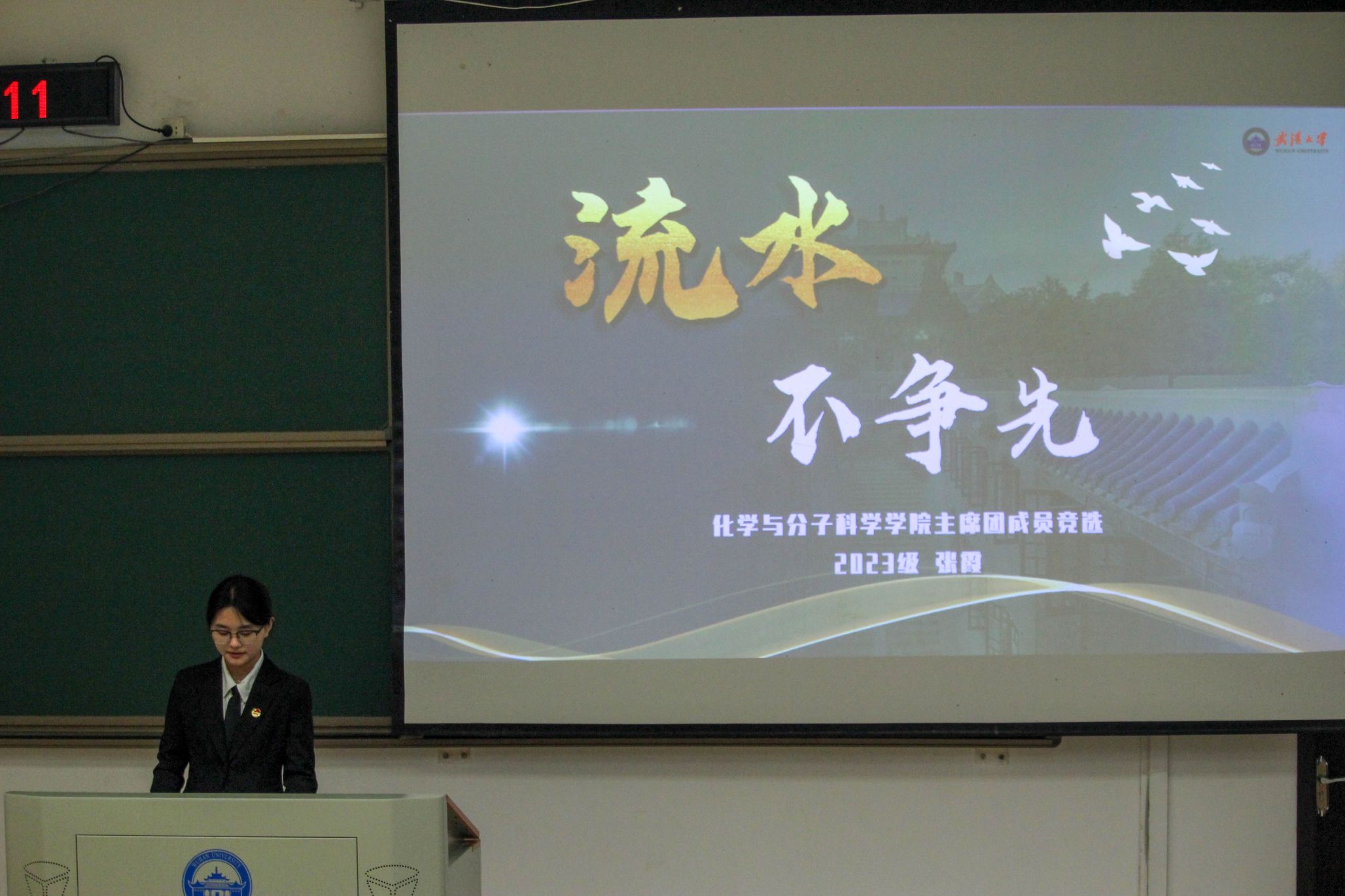 随后,唐昕浩、徐梦倩、陈久森、张霞四位主席团候选人依次上台发表竞选演讲并抽取题目进行答辩。